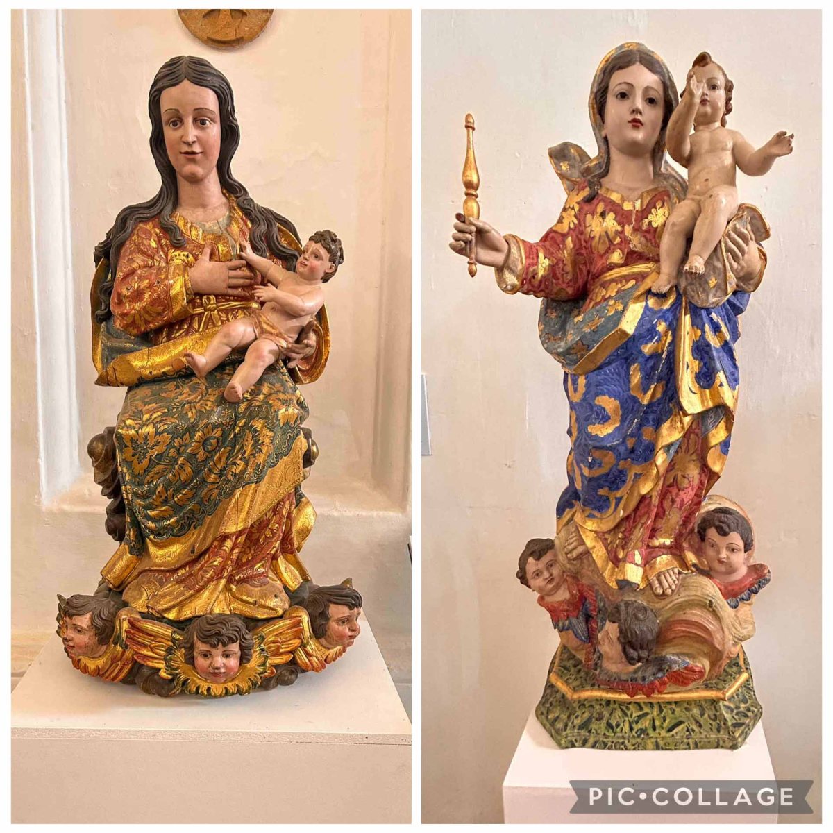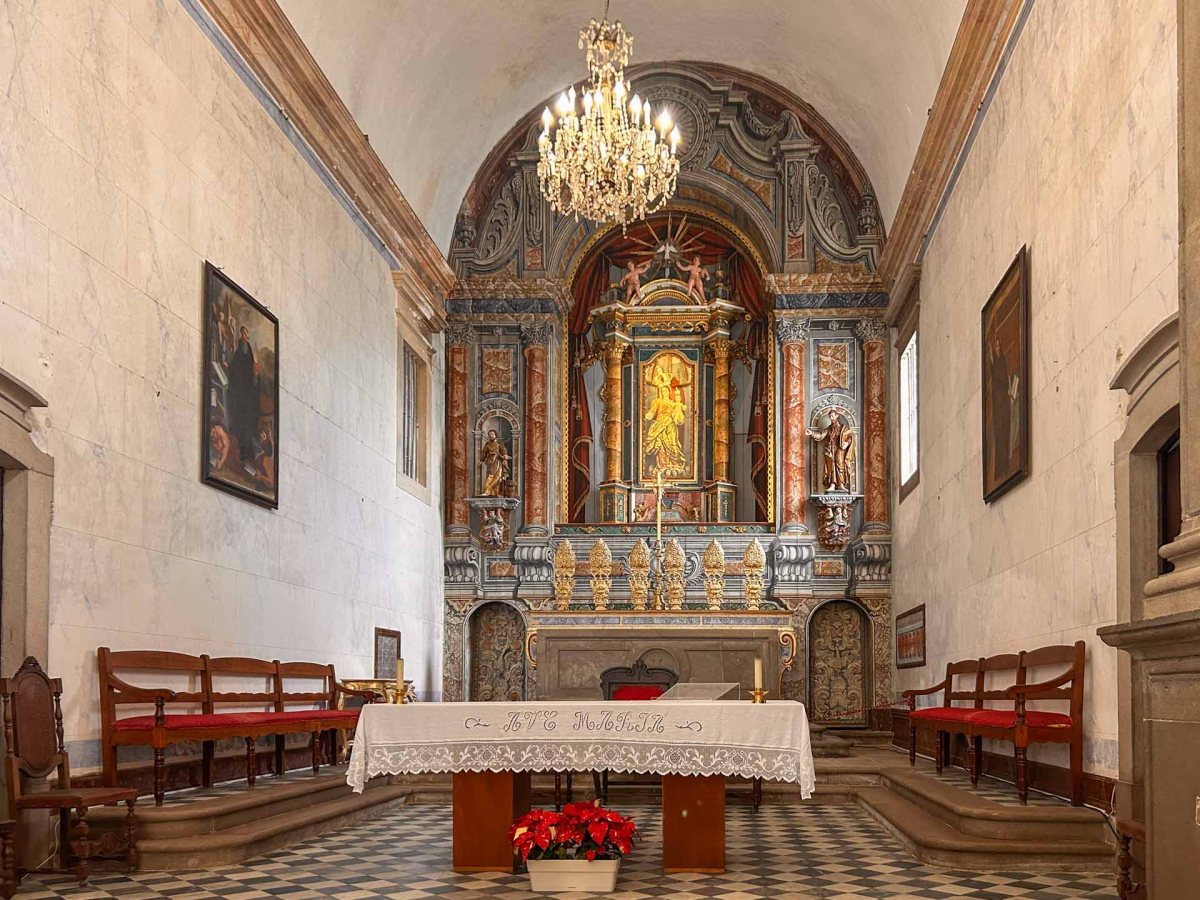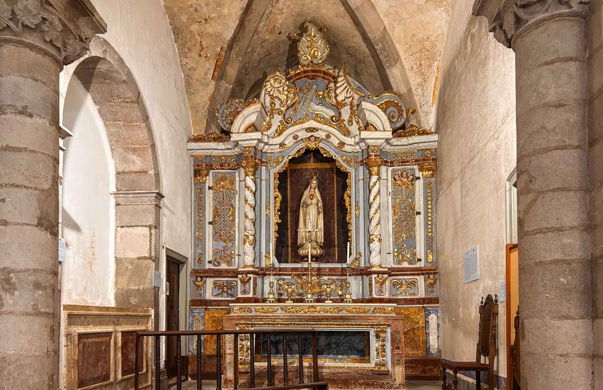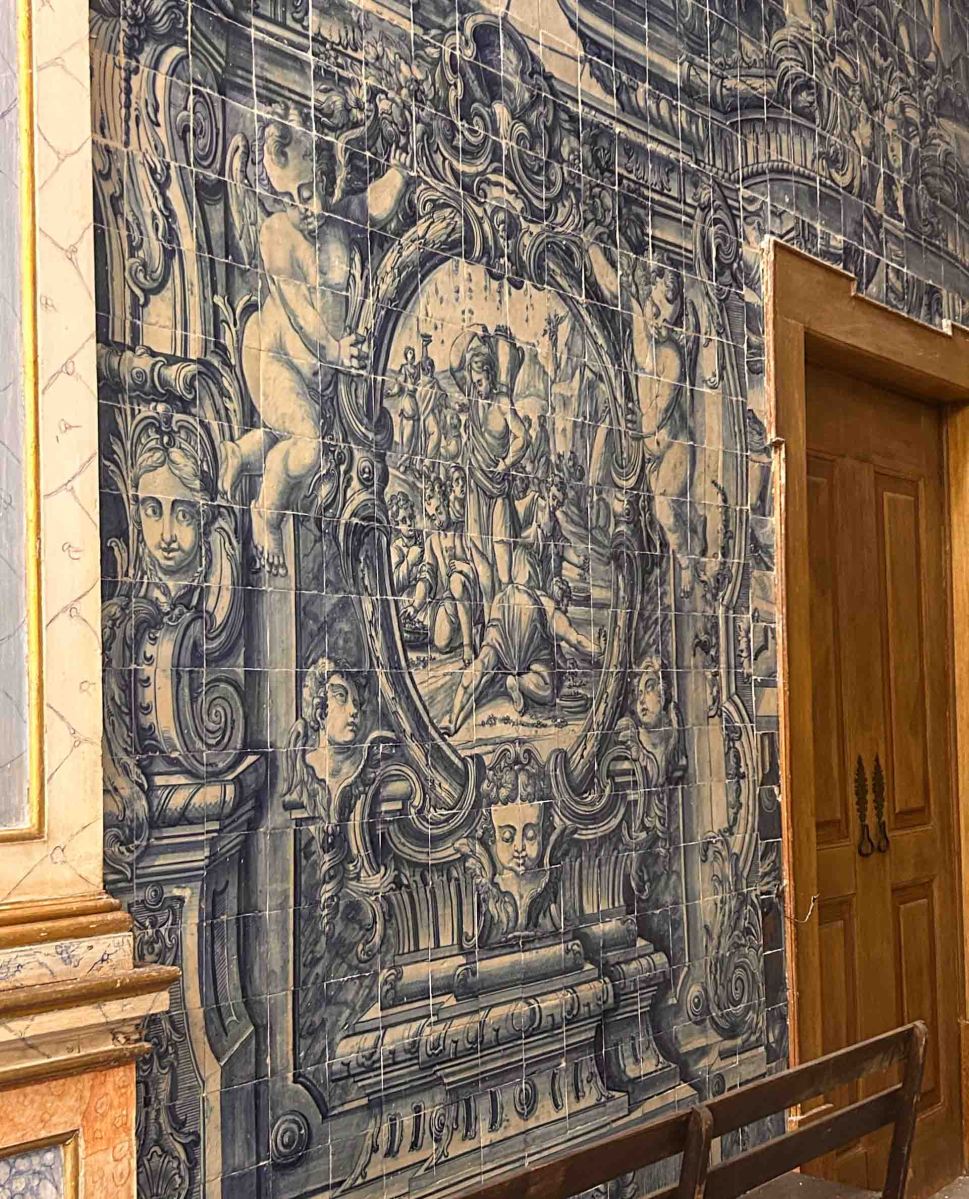 Vi går in i kyrkan vars interiör renoverades på 1800-talet. Här finns mängder med konstverk, bl a många madonnastatyer från olika århundraden. Det finns också flera olika kapell, ett par med vackra azulejos.