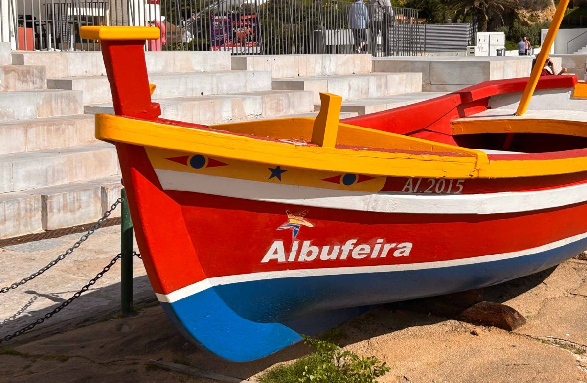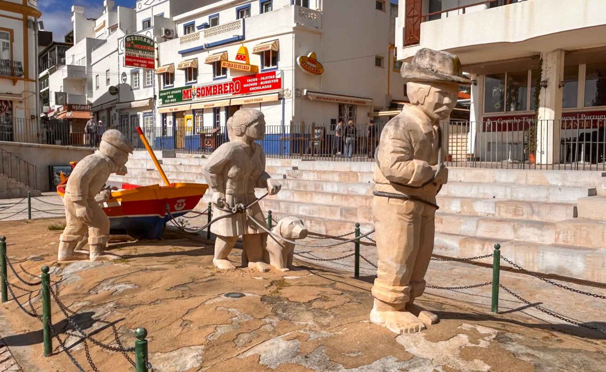 Här finns en ställplats vi åker till och det finns EN ledig plats, inte den helt optimala men helt ok för ett par nätter. En stor del av ställplatsens platser är upptagna av husbilar som säkert är säsongsboende, för det är uppbyggt allt möjligt runt omkring dem. Vi tar en promenad fram till centrum och en av stränderna. Precis som de flesta orterna här i Portugal är Albufeira rejält kuperad så här leder en lång rulltrappa ner till stranden, Praia dos Pescadores Fiskarnas strand, och ett litet torg där nere. Här går vi omkring och bara njuter i det fina vädret.