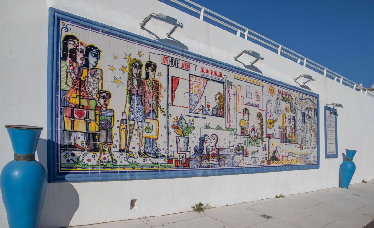 Sedan fortsätter vi uppför en trappa igen för nu ska vi gå till Albufeiras marina. När vi promenerar högt över vattnet passerar vi en riktigt trevlig kakelmålning av nyare datum. Den ska symbolisera att Albufeira genom århundradena alltid varit ett mål för ”resenärer”. Det har kommit romare, morer, korsriddare, mängder med handelsmän och på senare år naturligtvis turister. Den nedan är den nyare historien.