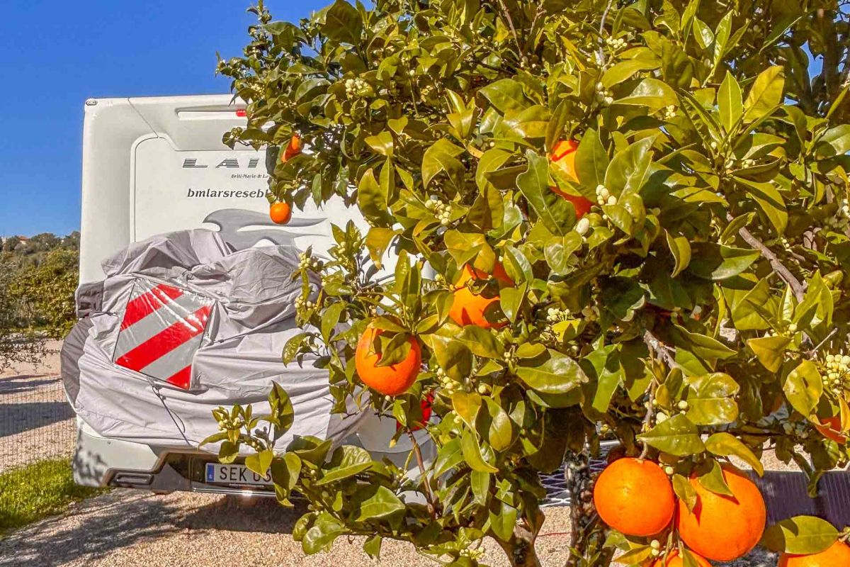 När vi lämnar Albufeira har vi bokat plats på en ställplats uppe i bergen, några km utanför den lilla byn Alte. Ställplatsen har 16 platser och man får boka minst tre nätter. Den heter Quinta Boa Vista och finns med i Park4Night. Det som är lite extra med den platsen är att den ligger i en apelsinodling. Platserna är stora och vi har flera apelsinträd på vår tomt. Nu är det lite mellansäsong så det finns en del frukt kvar på träden, samtidigt som nya blommor håller på att slå ut. De doftar helt underbart…