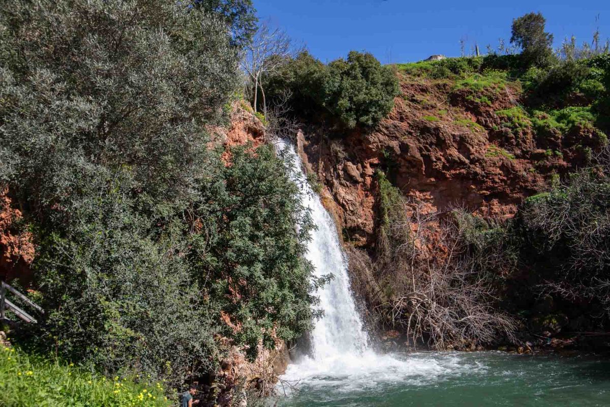 När vi kommer ner till byn och kyrkogården når vi de byggda trätrapporna som leder ner till det brusande vattenfallet. Nu efter allt regn som kommit är det verkligen fart på vattnet. Det faller 24 meter ner i en liten sjö. som ska vara populär för ett bad under varma sommardagar.