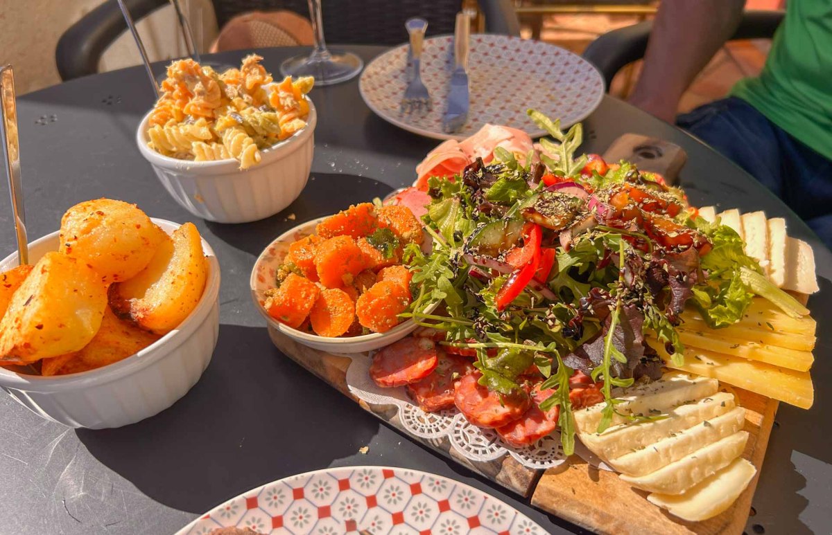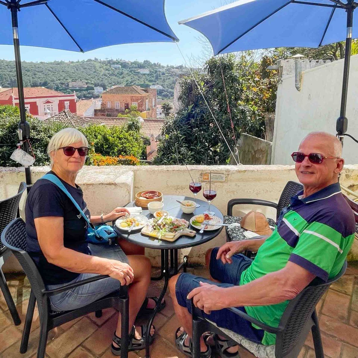 Dessutom fick jag tips om en hårfrisörska så mitt vildvuxna hår blev tuktat. Så sökte vi oss upp mot kyrkan där det ligger en liten sangria- och tapasbar, Segredo dos Mouros. Den har en mysig liten lokal och borden på den trånga terassen har en underbar utsikt. Här blev det ett glas sangria och en tapasbricka till lunch.