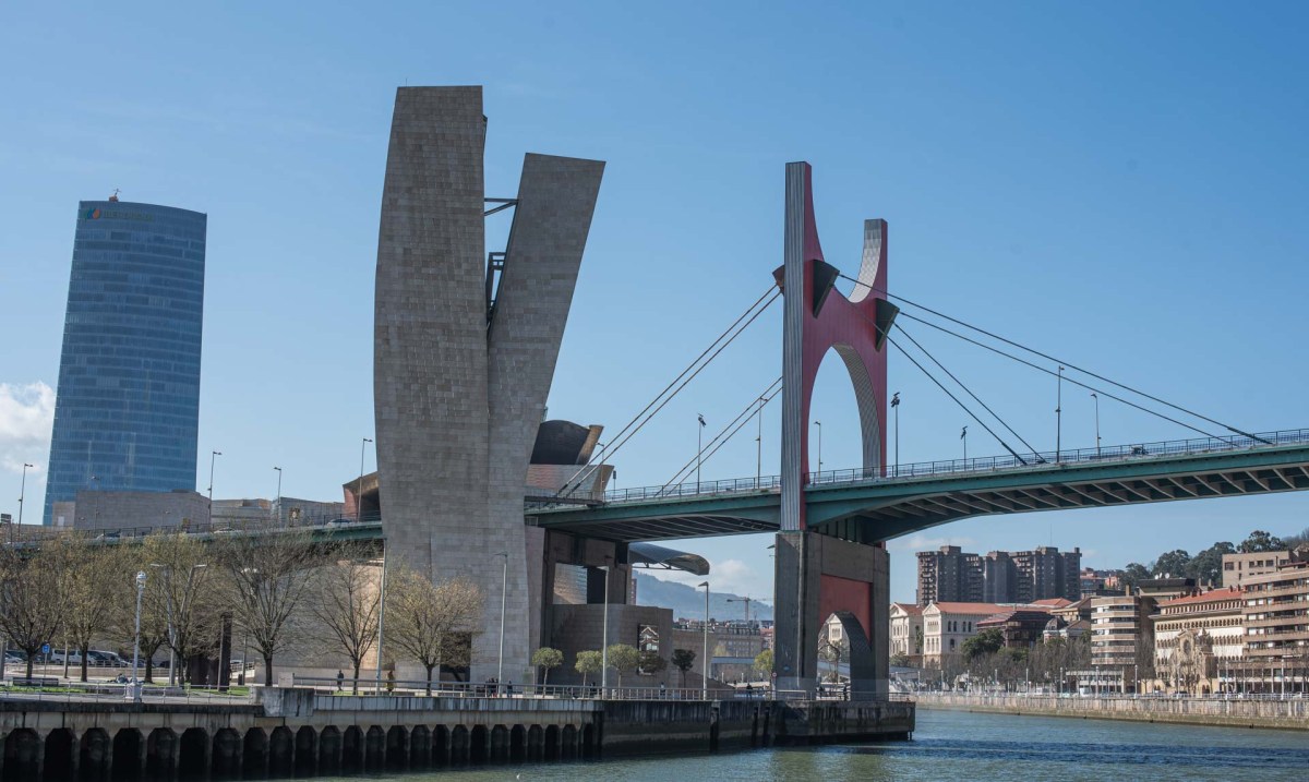 Vi promenerar mot muséet längs floden Nervión och kommer till bron Puente Salves, med sin röda port som syns vida omkring, även uppifrån ställplatsen. Porten, Arcos Rojos, är en skulptur av Daniel Buren.