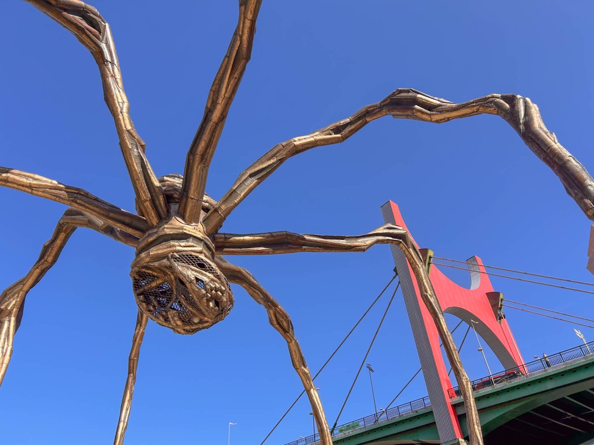 Vi tar oss upp på bron på lite olika sätt, Lars via mängder med trappor medan B-M lite mer lättsamt tog hissen. Vi promenerar längs bron och under Arcos Rojos. Här uppifrån ser vi bl a den berömda spindelskulpturen, Maman, av Louise Bourgeois från 1999. Den ska vi titta närmare på lite senare.