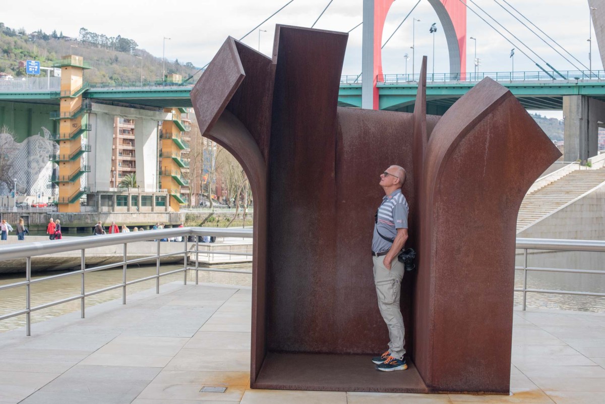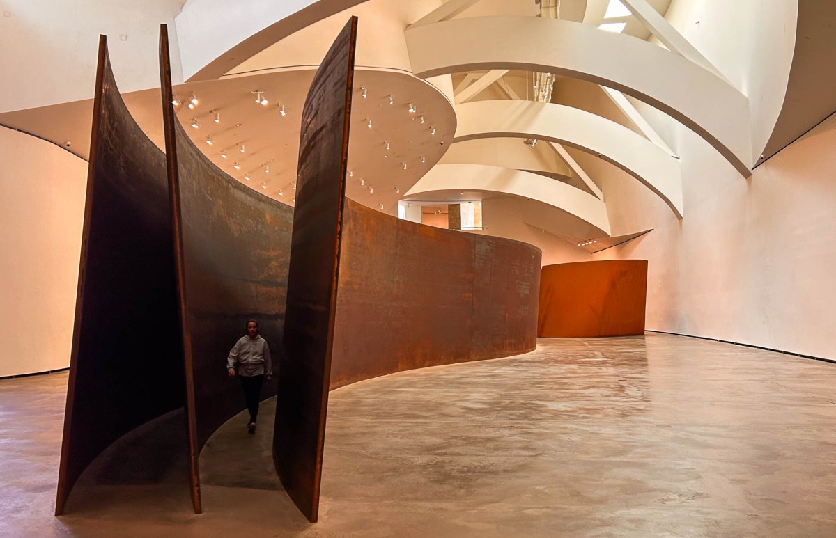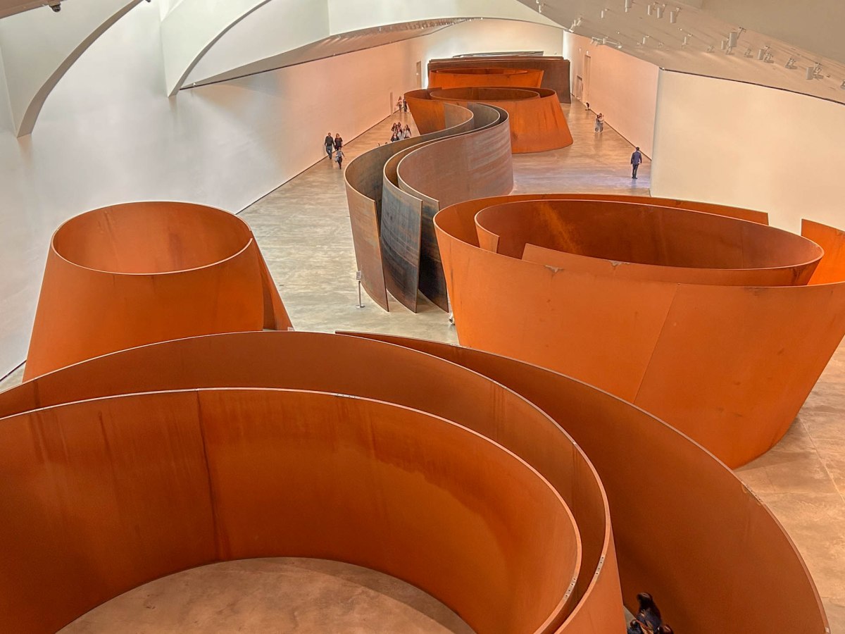 Vår andra dag i staden har vi bokat biljetter till kl. 11, för nog tycker vi att man bör ha sett det här muséet. Förra gången vi var här var det måndag och som de flesta muséer är även detta stängt då. När vi kommer in i den stora entréhallen visar pilar till Galleri 104, eller Fisk-galleriet som det också kallas. Det är ett 130 meter långt rum där installationen The Matter of Time finns. Det består av åtta enorma skulpturer i cortenstål av Richard Serra.